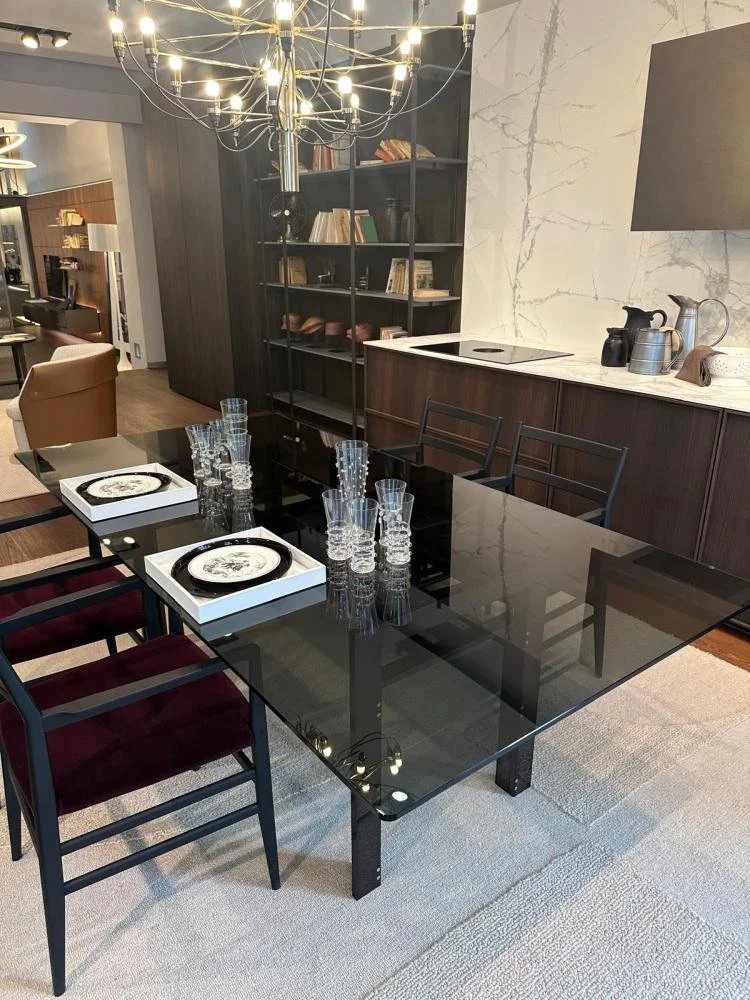 La base architettonica in alluminio o in acciaio, definita da profili piatti con spessore accentuato, costituisce la parte essenziale di questo iconico tavolo con piano in vetro, dove l’eleganza raffinata della base diventa protagonista attraverso la trasparenza del piano.