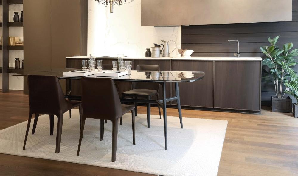 La sedia Isabel presenta una linea asciutta ed essenziale. È interamente rivestita in cuoio marrone scuro 5013, gambe incluse, ed è caratterizzata da uno schienale avvolgente ed estremamente confortevole.