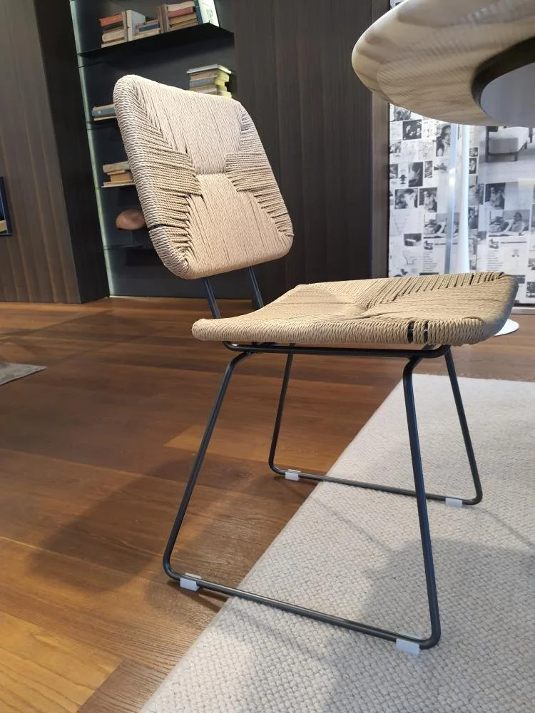 La struttura delle sedie Echoes manifesta una linea essenziale ed è realizzata in rigoroso metallo, mentre seduta e schienale sono caratterizzati da un fine intreccio in cordoncino di carta o paglia di fiume, una lavorazione all’apparenza semplice e tuttavia complessa, ancora oggi interamente realizzata a mano.