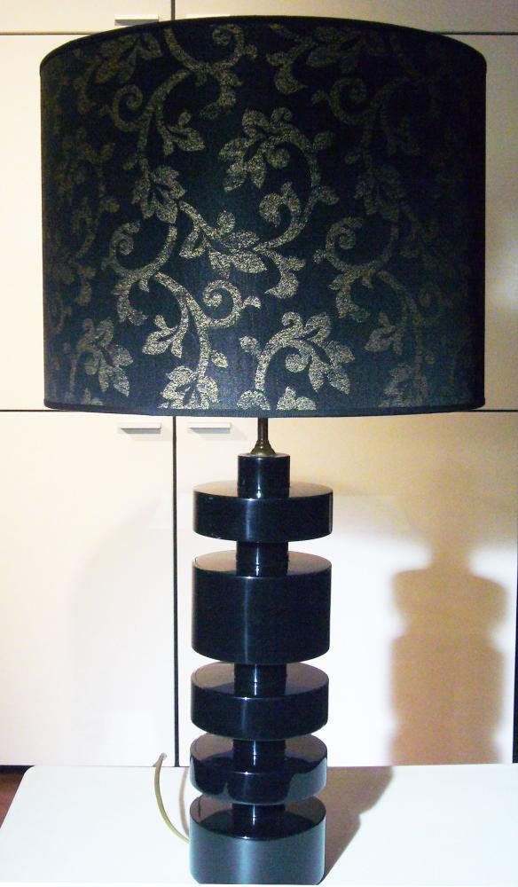 Lampada da tavolo con struttura laccata nera lucida e paralume in stoffa color nero/oro.