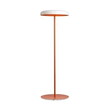 Lampada da terra a forma di fungo con stelo in metallo tinto arancio e paralume in metallo laccato arancio internamente e bianco esternamente.