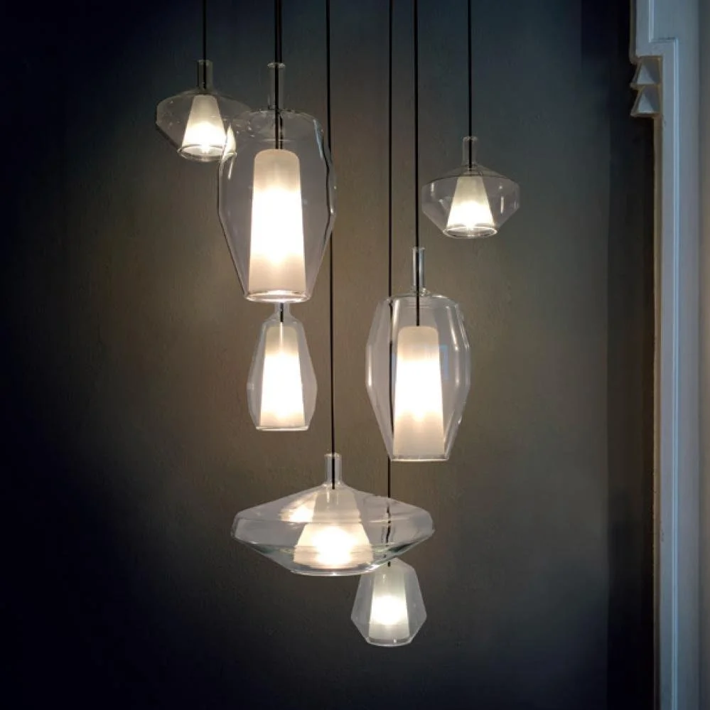 Lampade sospensione realizzate in vetro borosilicato. Morbidi angoli smussati, ottenuti con particolari raggi di curvatura, mentre la colorazione e la finitura matt restituiscono una superficie mor...