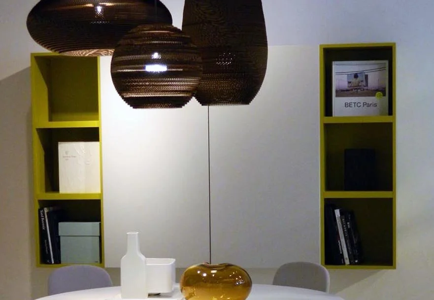 N°2 pensili a giorno laccati avorio e struttura giallo mustard L83. Cm 40xh119,6xpr.34