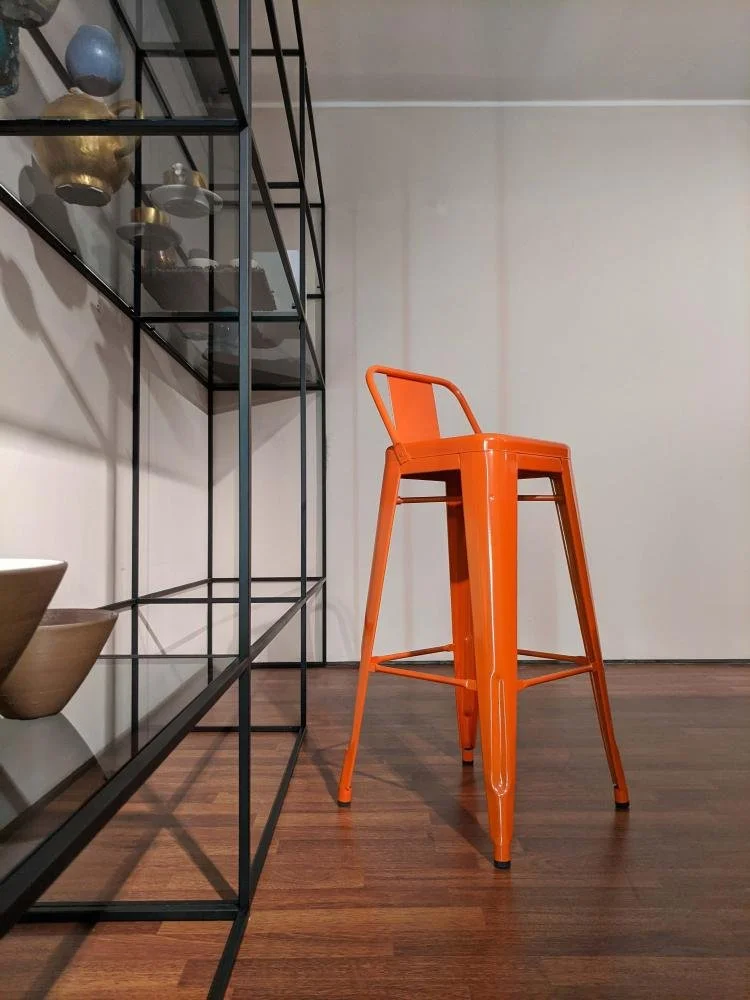 Sgabello in ferro laccato arancio lucido con schienale