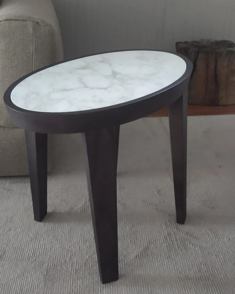 Tavolino in frassino tinto marrone e piano in marmo Calacatta oro opaco.