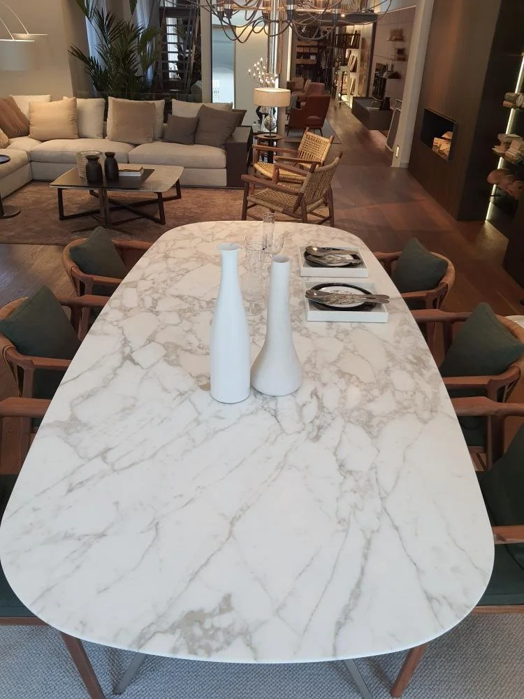 Tavolo con struttura in metallo satinato, piano in marmo Calacatta oro opaco